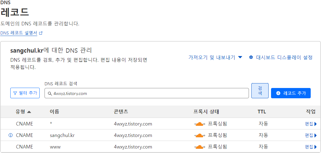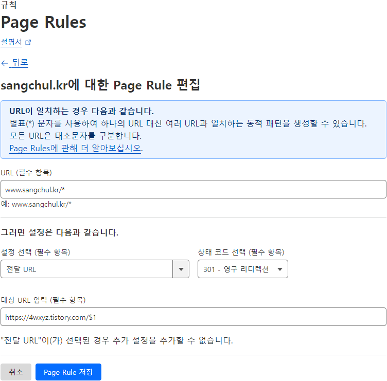 이제 클라우드플레어는 설정한 규칙에 따라 해당 도메인으로 들어오는 모든 요청을 티스토리 블로그로 리디렉션합니다. 변경 사항이 적용되려면 일정 시간이 소요될 수 있으며 도메인 등록기록을 업데이트해야 할 수도 있습니다.