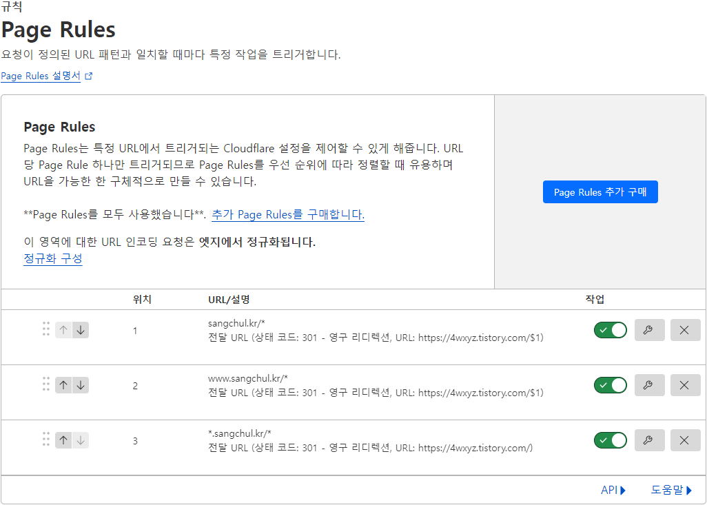 "새로운 페이지 규칙 추가" 또는 "새로운 페이지 룰 추가" 버튼을 클릭합니다.