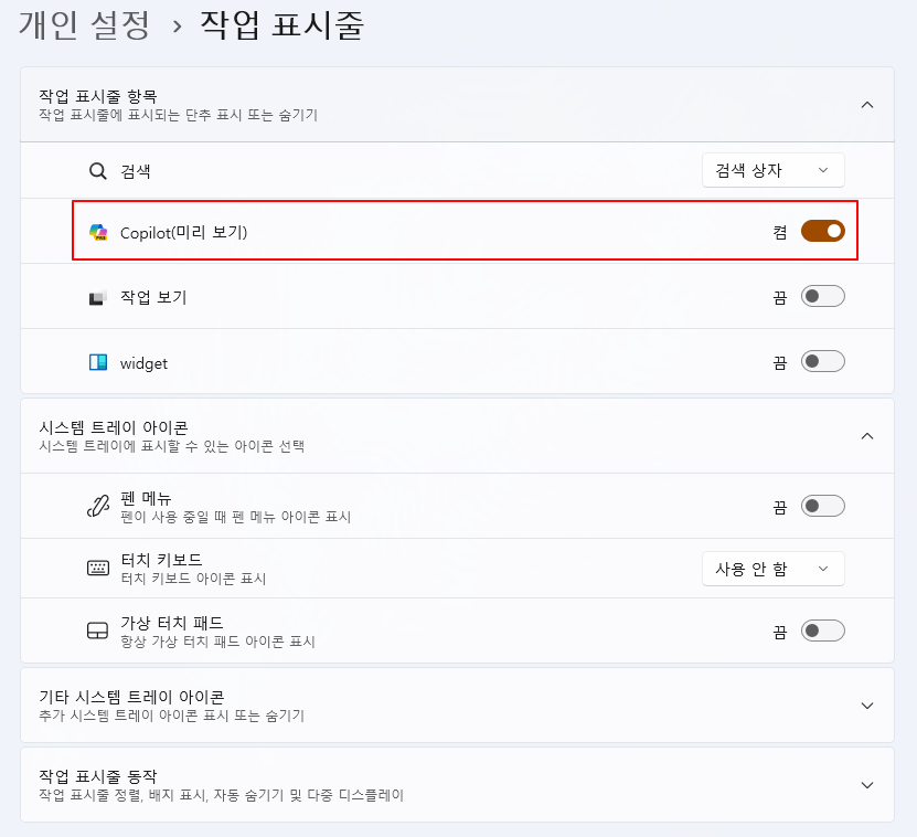 - "작업 표시줄에서 항목 표시" 아래에서 "코파일럿"을 선택 취소합니다.