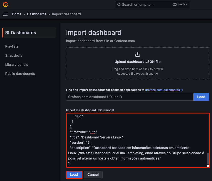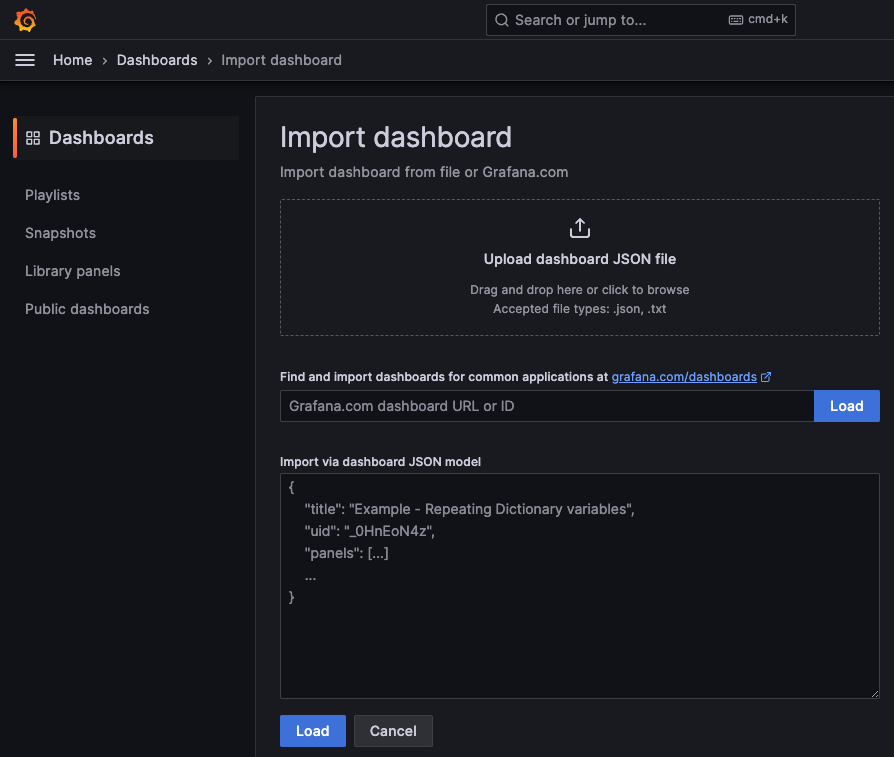 Grafana 대시보드를 JSON 파일을 사용하여 가져오는 방법입니다.