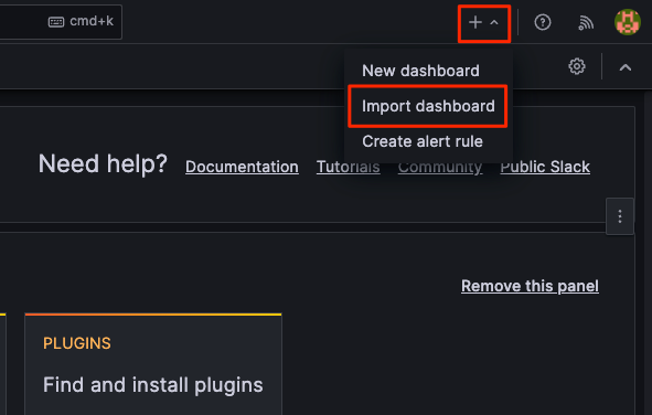 2. 좌측 사이드바에서 플러스 (+) 아이콘을 클릭하고 "Import dashboard"를 선택합니다.