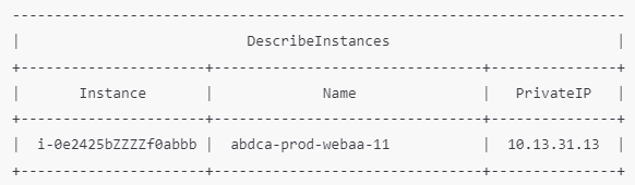--query 'Reservations[*].Instances[*].{Name: Tags[?Key==`Name`].Value | [0], Instance:InstanceId, PrivateIP: PrivateIpAddress}' \