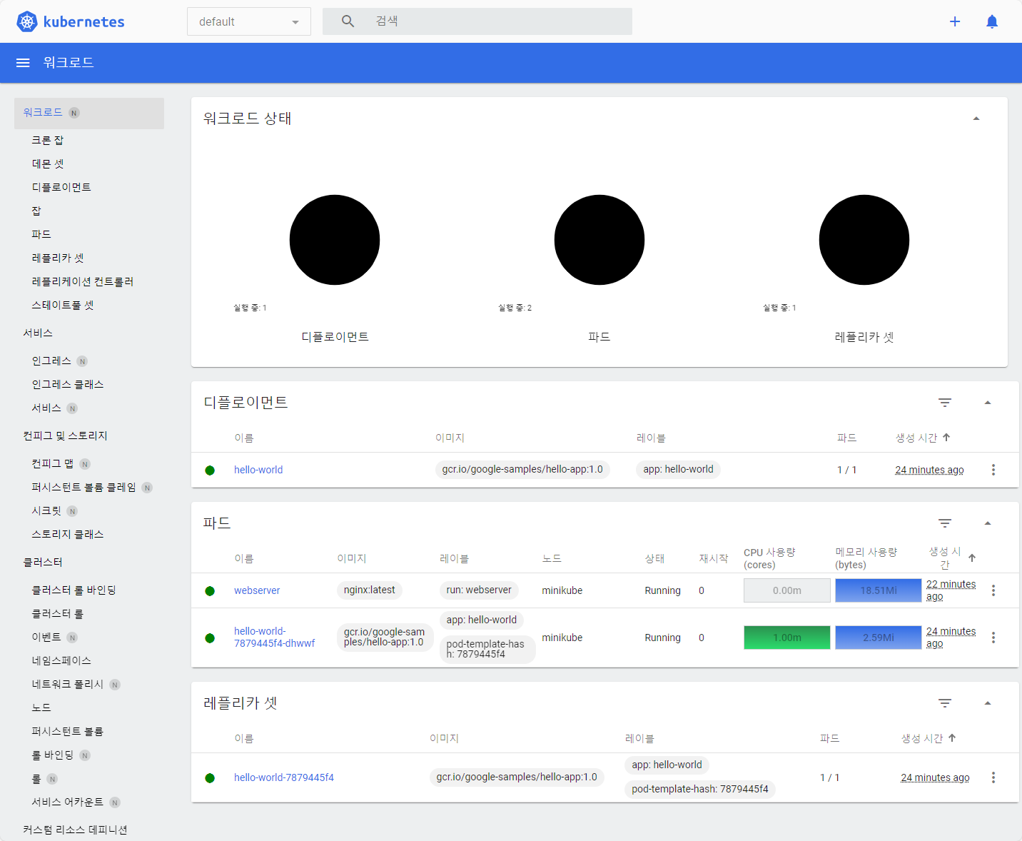 - 지정된 이미지를 사용하여 "hello-world"이라는 이름의 새로운 디플로이먼트를 생성합니다. 이 디플로이먼트는 샘플 웹 애플리케이션을 배포합니다.