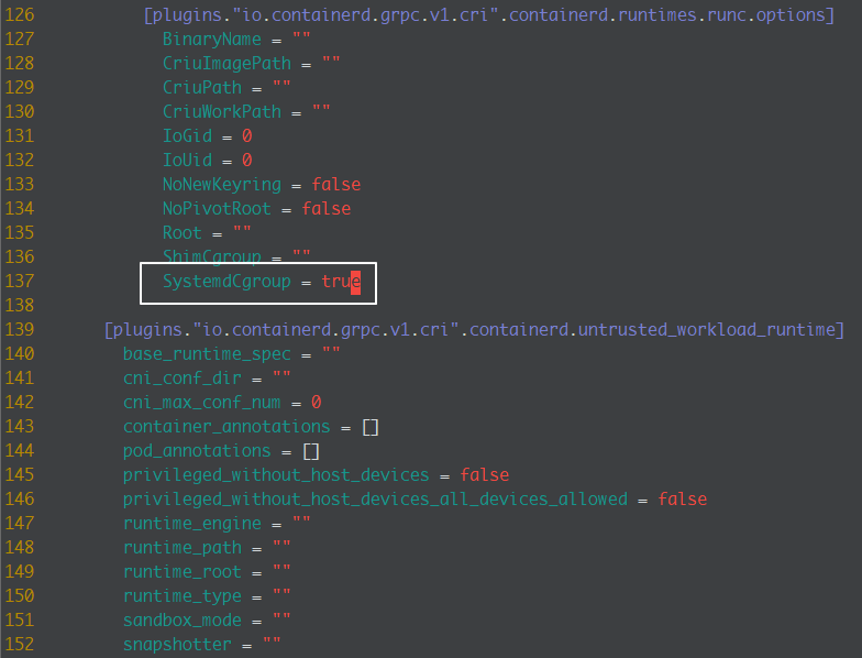 - SystemdCgroup = false -> SystemdCgroup = true