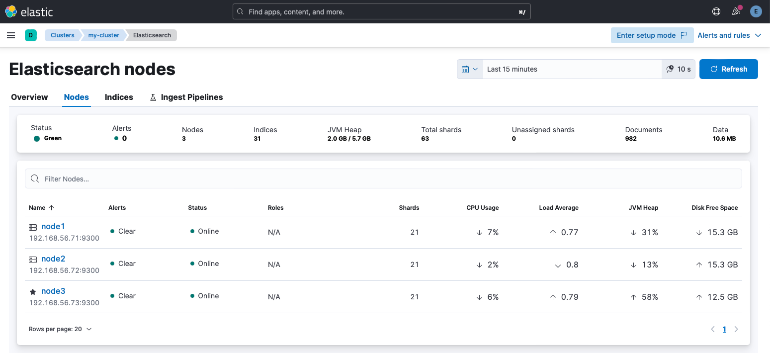 $ curl -k -u elastic:$ELASTIC_PASSWORD https://localhost:9200/_cat/nodes?v