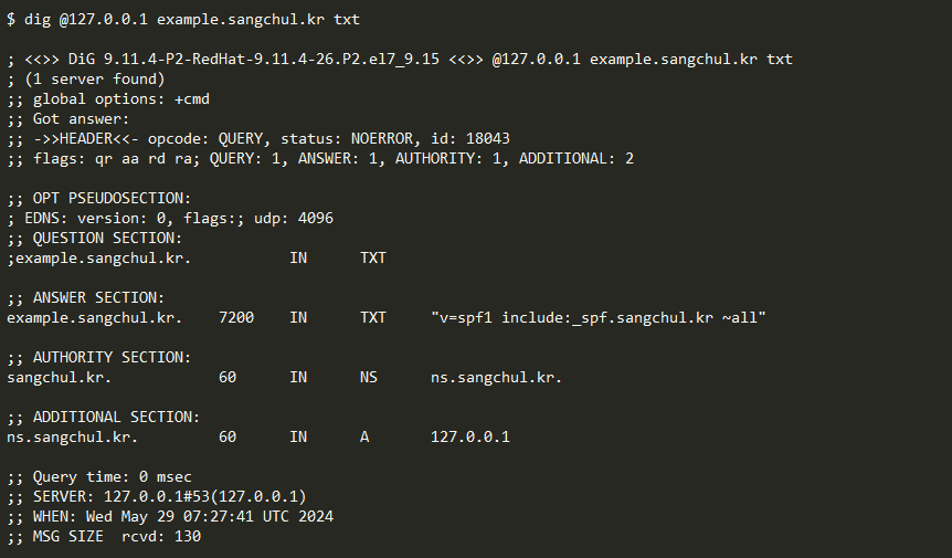 > update add example.sangchul.kr. 7200 IN TXT "v=spf1 include:_spf.sangchul.kr ~all"