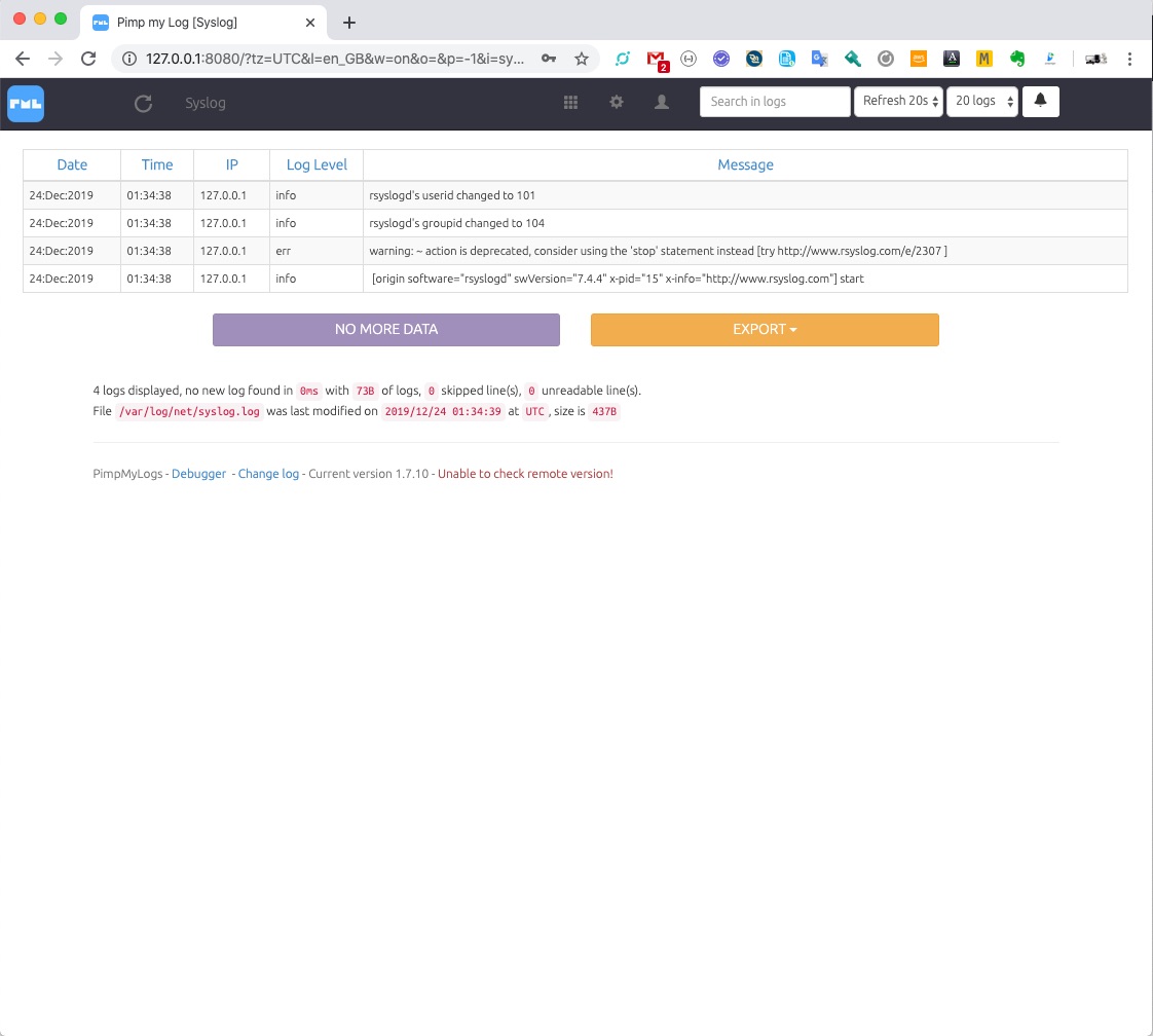 pbertera/syslogserver로 구성된 Docker 기반 Syslog 서버가 클라이언트 장치로부터 수신한 로그 데이터를 수집하고 저장합니다.