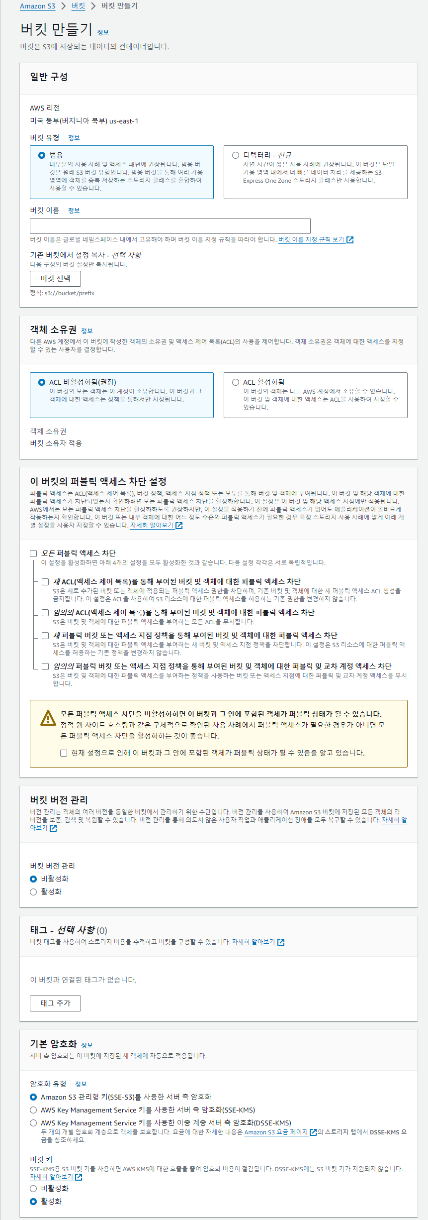 - 버킷의 리전은 CloudFront 배포에서 Origin Domain으로 사용하기 위해 AWS의 동일 리전에 설정합니다.