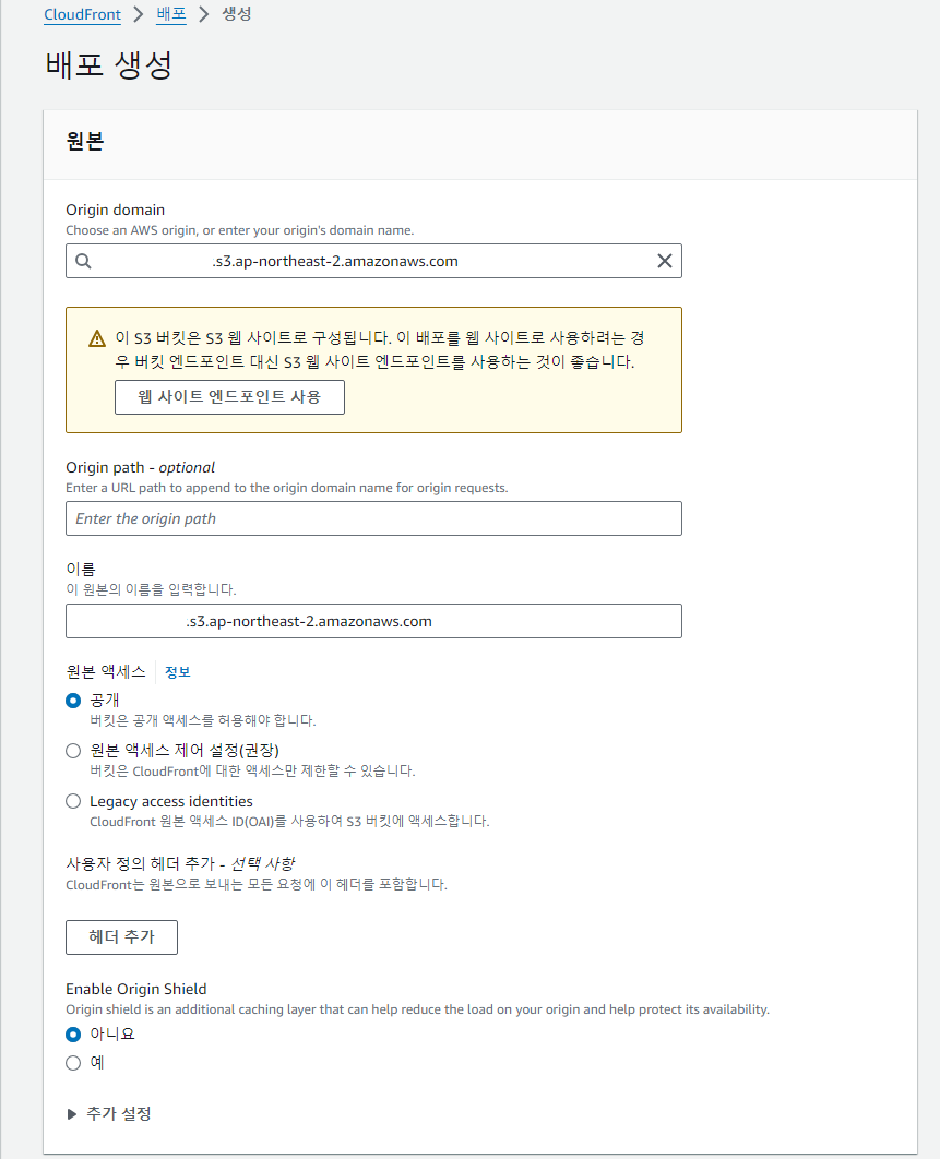 - 버킷의 리전은 CloudFront 배포에서 Origin Domain으로 사용하기 위해 AWS의 동일 리전에 설정합니다.
