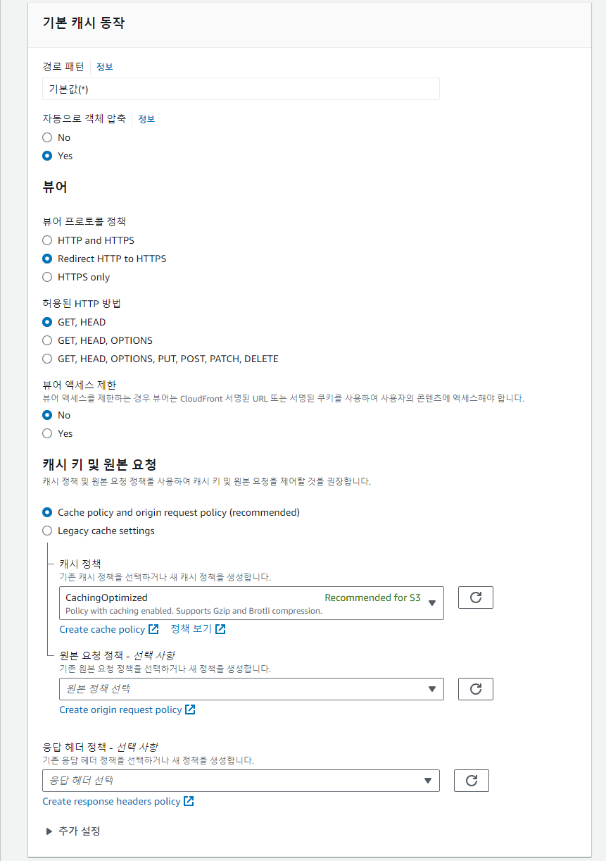 - Cache Policy 및 기타 설정을 필요에 맞게 구성합니다.