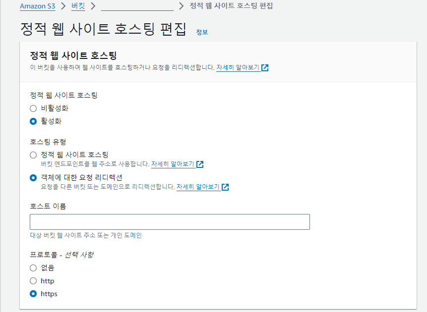 - Host a static website를 선택하고 Redirect requests를 선택한 후 리디렉션할 대상 URL을 입력합니다.