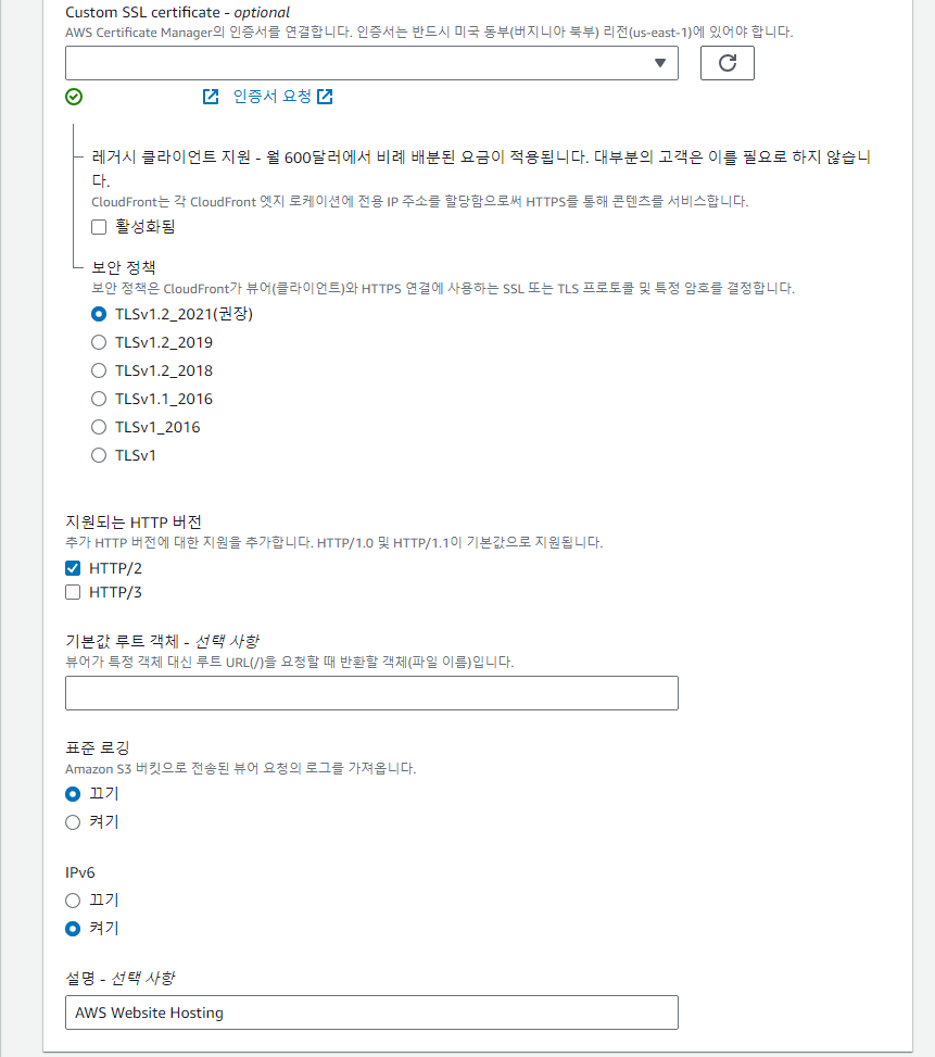 - SSL Certificate 섹션에서 ACM을 통해 생성한 SSL 인증서를 선택합니다.