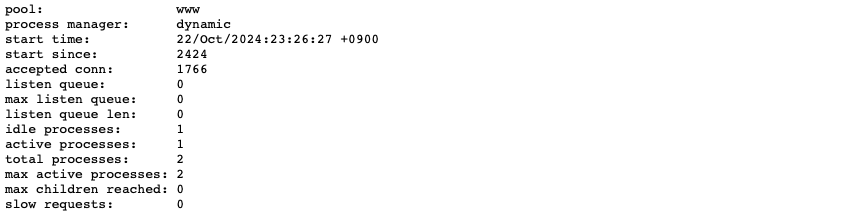 PHP-FPM의 real-time status 페이지 기능이 활성화되었습니다. 상태 페이지에는 현재 PHP-FPM의 프로세스 및 요청 처리 상태에 대한 정보가 표시됩니다.
