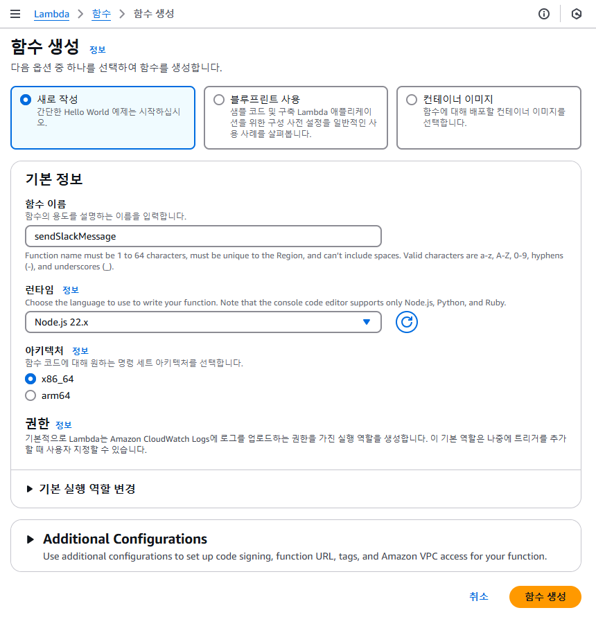 AWS Lambda 콘솔에서 "함수 생성" 클릭