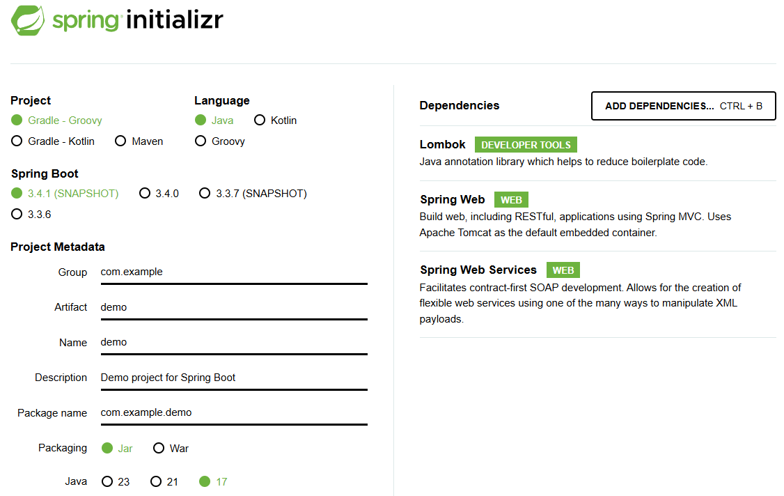 - 의존성 설정 : Spring Boot DevTools, Spring Web, Lombok