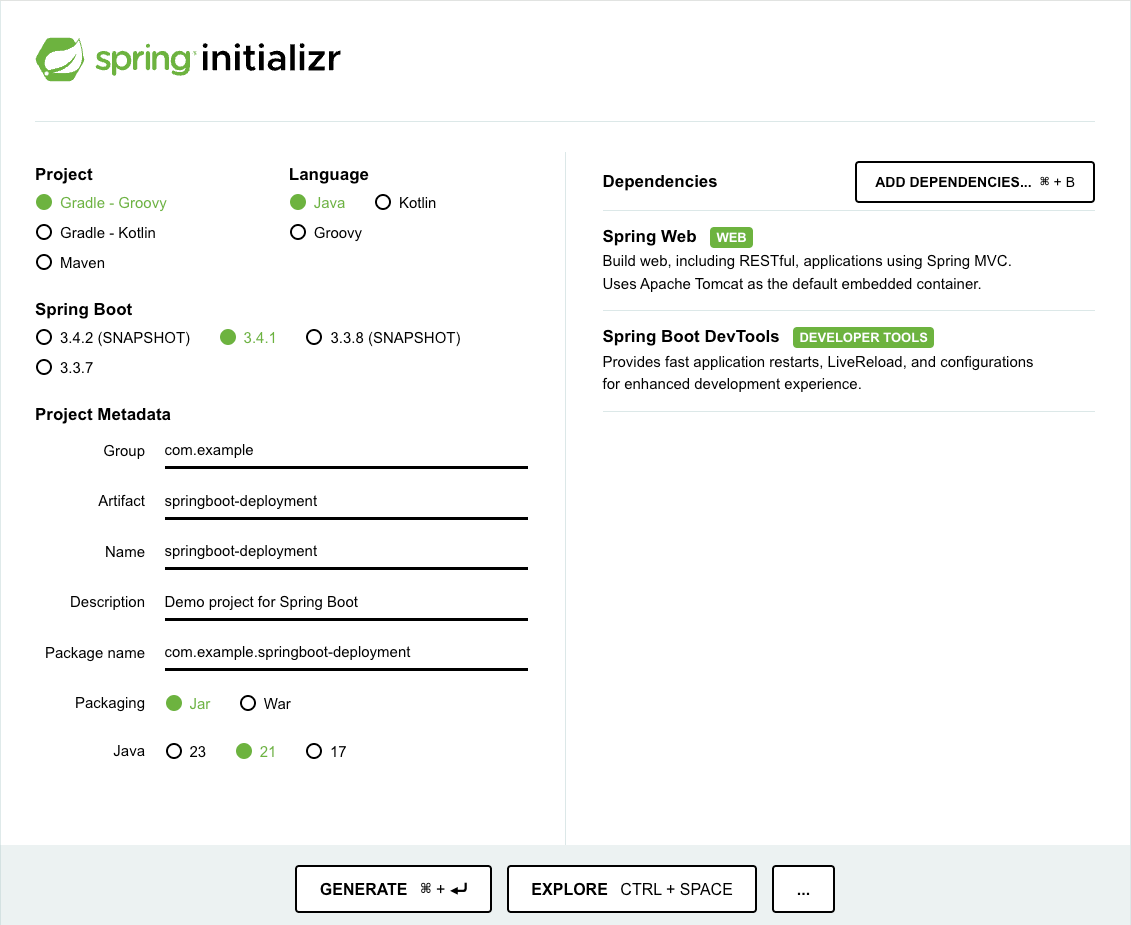 웹 페이지에서 스프링 부트 프로젝트 생성