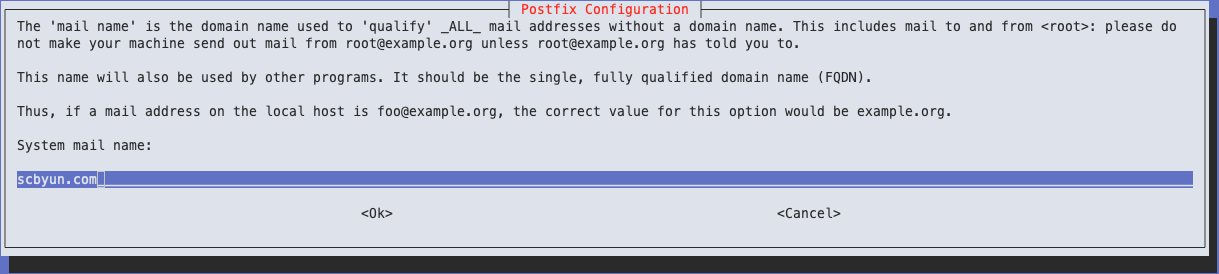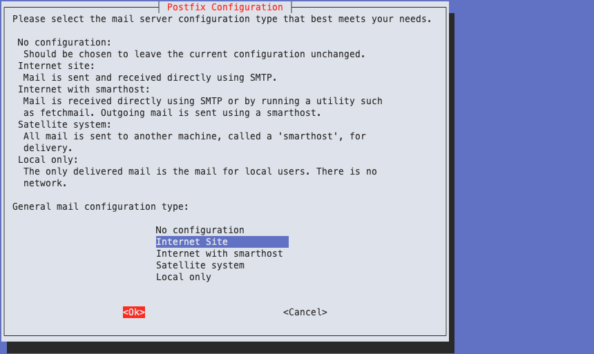 설치 중에 Postfix 설정 구성 화면이 나타납니다.