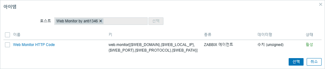 Zabbix UI → 데이터 수집 → 템플릿(Web Monitor by anti1346) → 아이템 → 아이템 생성
