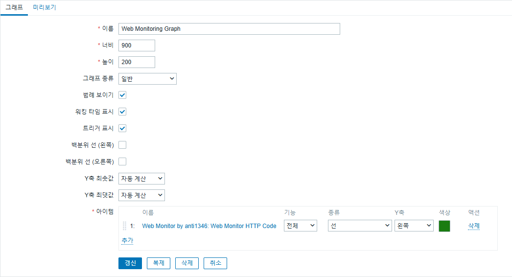 Zabbix UI → 데이터 수집 → 템플릿(Web Monitor by anti1346) → 그래프 → 그래프 생성