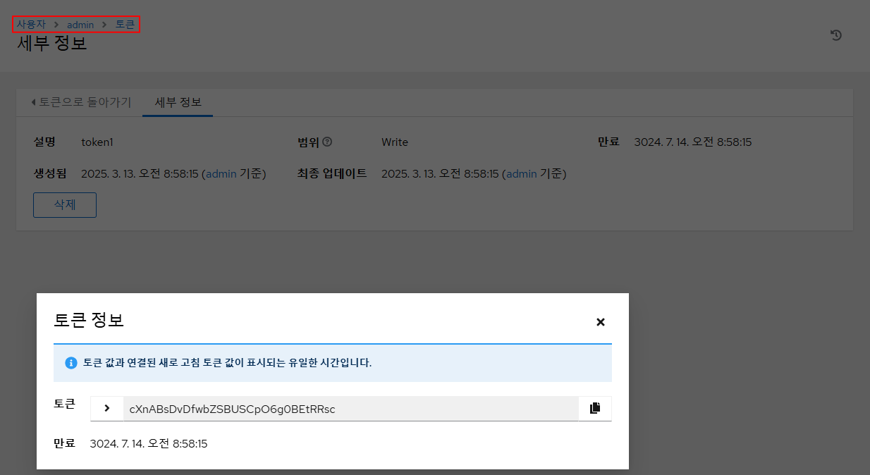 - 사용자(admin) 선택 → 토큰 탭 → 추가 클릭
