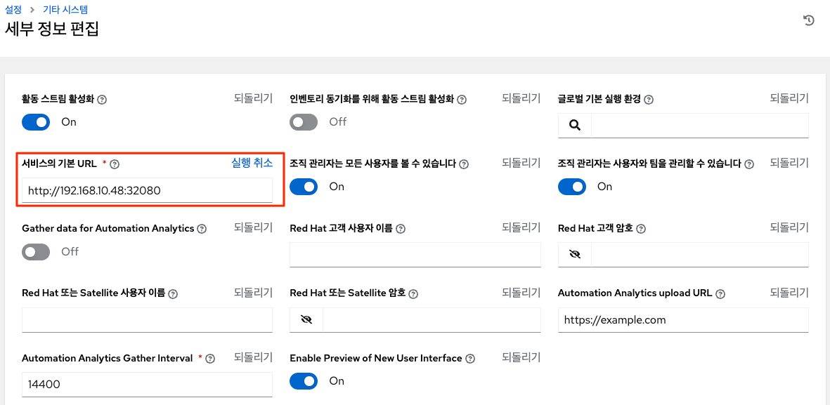 설정 > 기타 시스템 > 서비스의 기본 URL(https://towerhost) 편집
