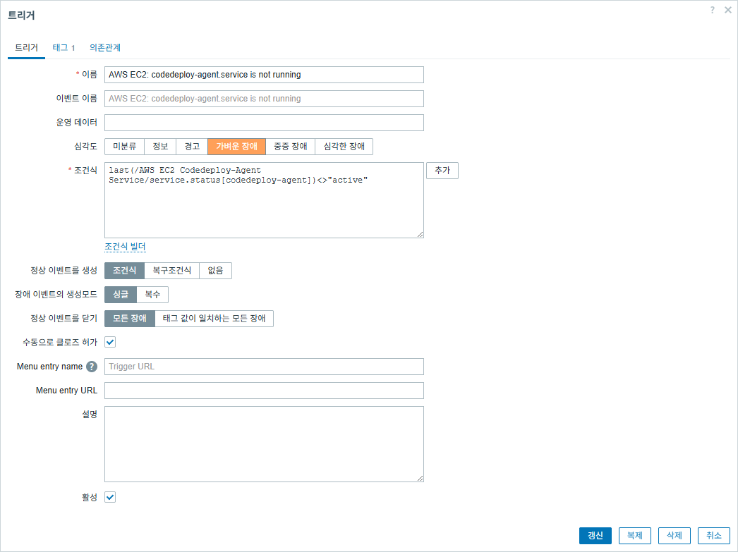 - Expression: last(/AWS EC2 Codedeploy-Agent Service/service.status[codedeploy-agent])<>"active"