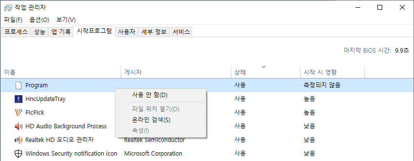 윈도우 10의 시작 프로그램 목록에서 Program 프로세스를 삭제하는 방법