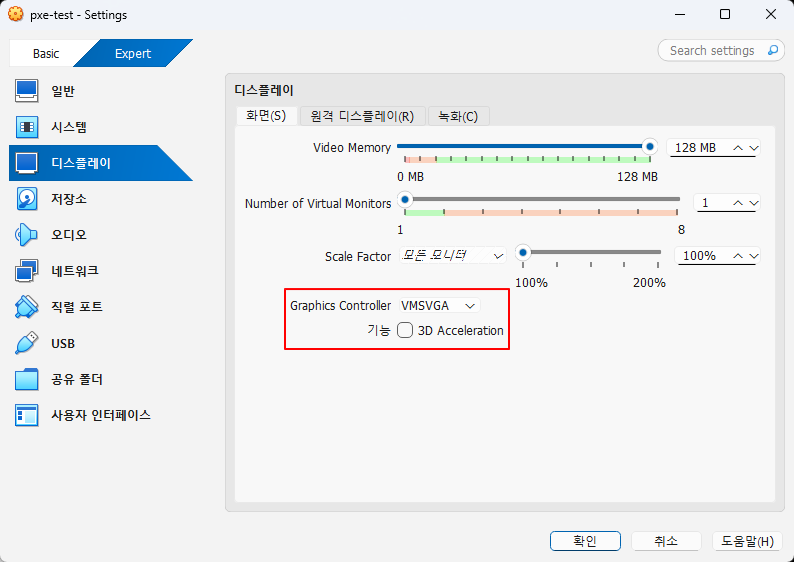 - VMSVGA → VBoxSVGA 또는 VBoxVGA로 변경