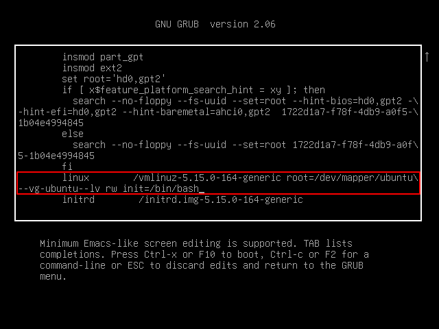 4. linux 라인에서 ro quiet splash 부분을 찾아 rw init=/bin/bash 로 변경