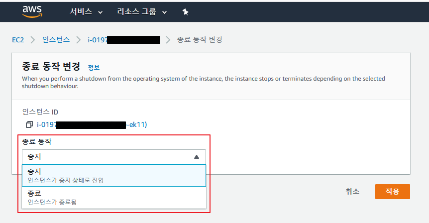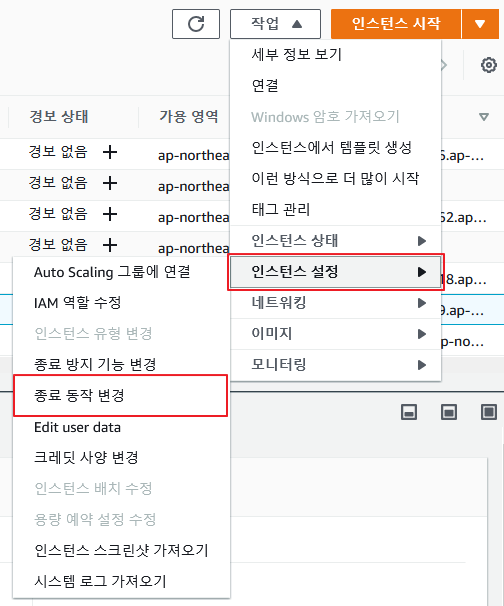 - 인스턴스 선택 > 작업 > 인스턴스 설정 > 종료 동작 변경