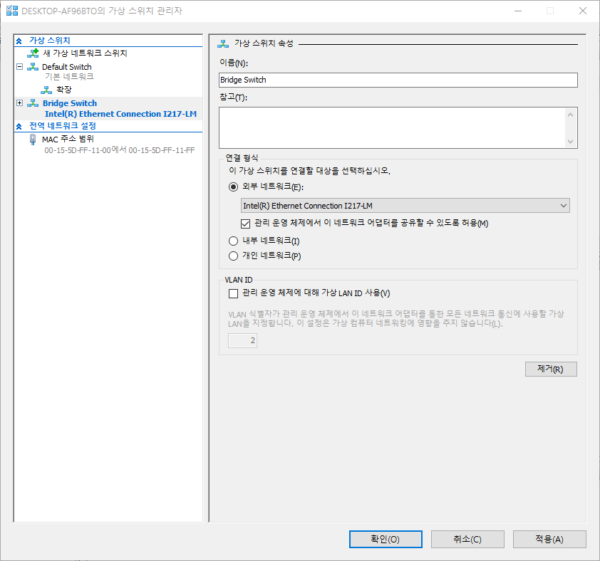 Windows 10에서 Hyper-V 가상스위치(브릿지 모드) 설정