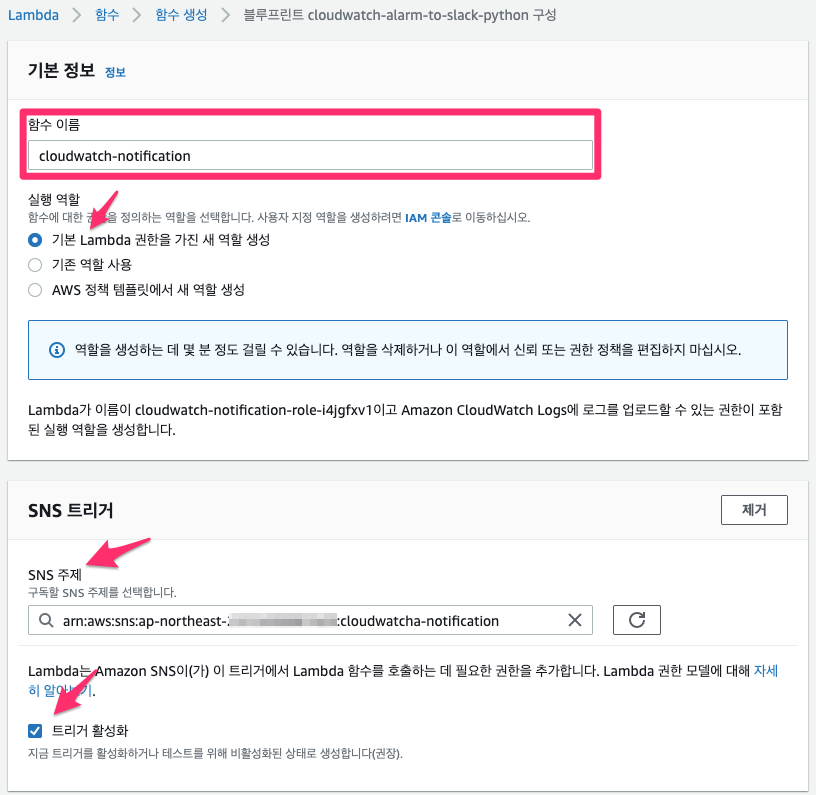 실행 역할에는 AWSLambdaBasicExecutionRole과 AmazonSNSFullAccess 정책을 추가합니다.