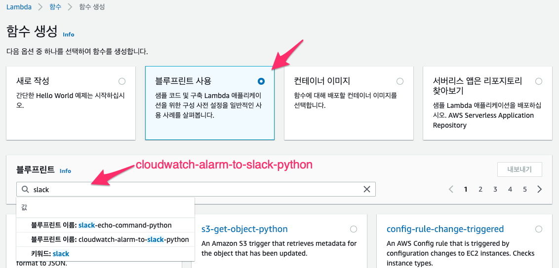 - 블루프린트 : cloudwatch-alarm-to-slack-python