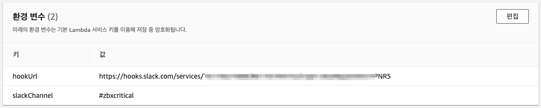 AWS 콘솔에서 Lambda > 함수 > 함수 생성 > 블루프린트 > cloudwatch-alarm-to-slack-python > 환경 변수 값 입력