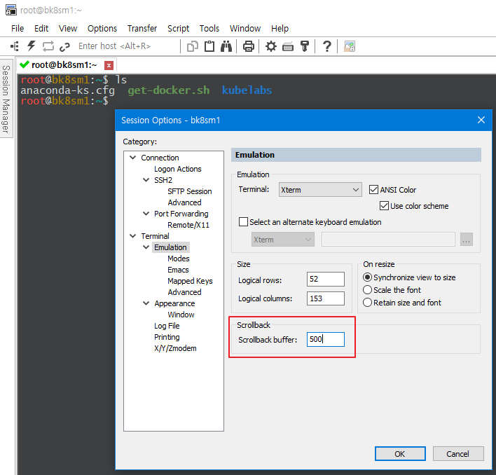 SecureCRT에서 Scrollback buffer size(스크롤백 버퍼 크기)를 설정하는 방법