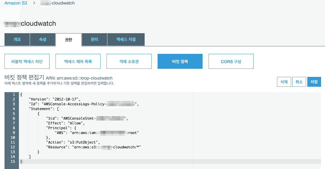 - S3 콘솔로 이동하여 로그를 저장할 버킷을 선택합니다.(Amazon CloudWatch 버킷 생성)