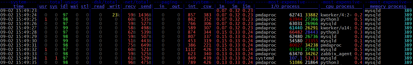 위의 명령어를 실행하면 시간, CPU 사용률, 디스크 I/O, 메모리 사용량 및 로드에 대한 정보가 실시간으로 표시됩니다. 이를 통해 시스템의 성능 및 리소스 사용 상태를 모니터링할 수 있습니다.