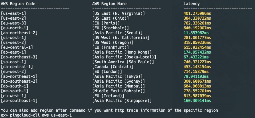 pingcloud-cli is command line tools to check latency and http trace from AWS, GCP and Azure regions.