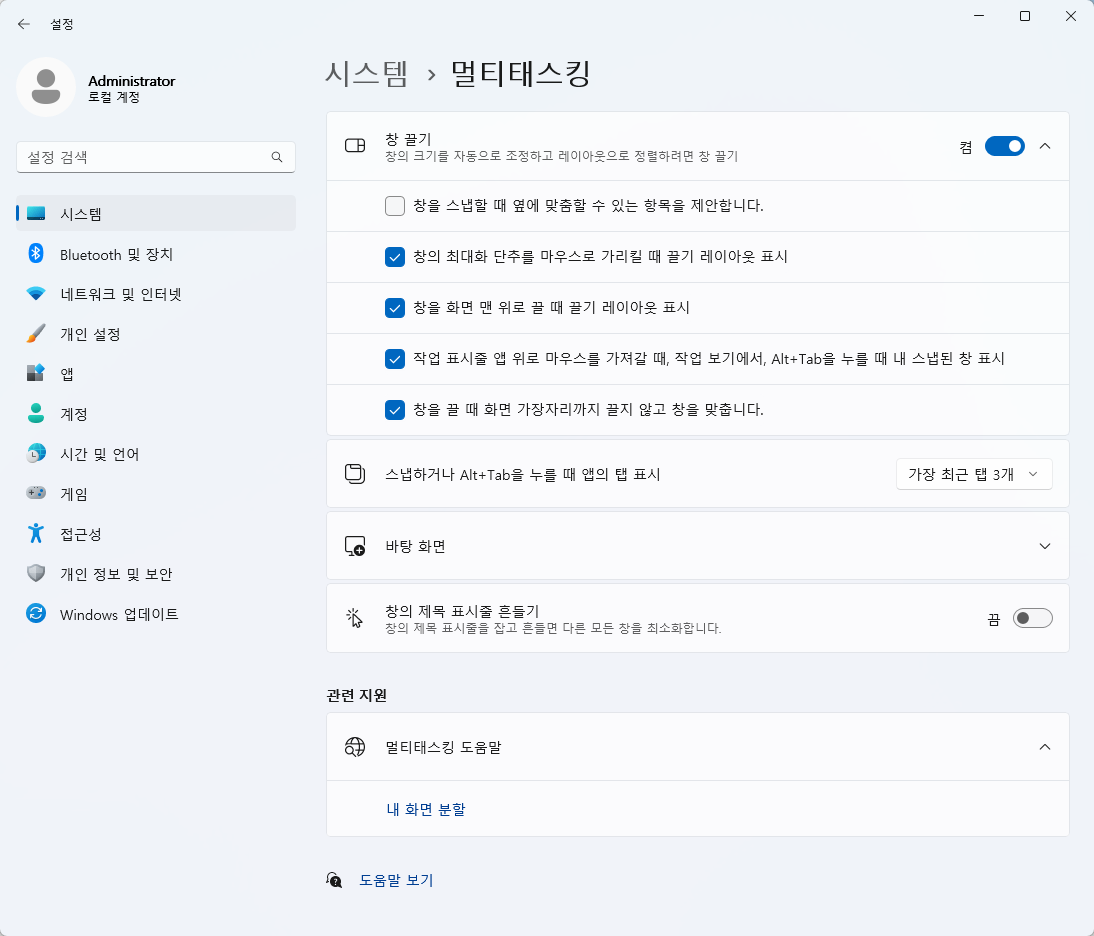 Windows 설정 > 시스템 > 멀티태스킹 > 창 맞춤