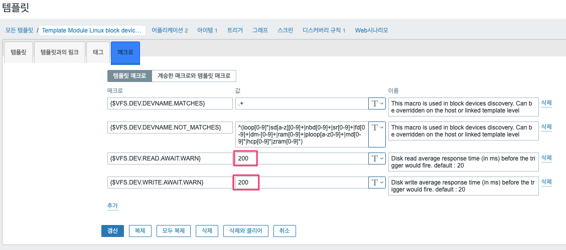 [설정] > [템플릿] > "Template Module Linux block devices by Zabbix agent" 편집