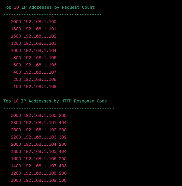 이 결과는 주어진 로그 파일에서 상위 IP 주소 및 HTTP 응답 코드를 요청 횟수 순으로 보여줍니다. RANK, LOGLINE, LOGFILE을 필요에 따라 조절하여 원하는 결과를 얻을 수 있습니다.