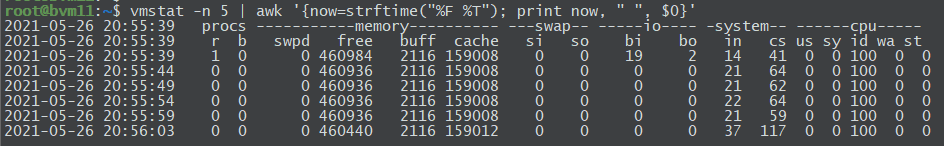 vmstat -n 5 | awk '{now=strftime("%F %T"); print now, " ", $0}'