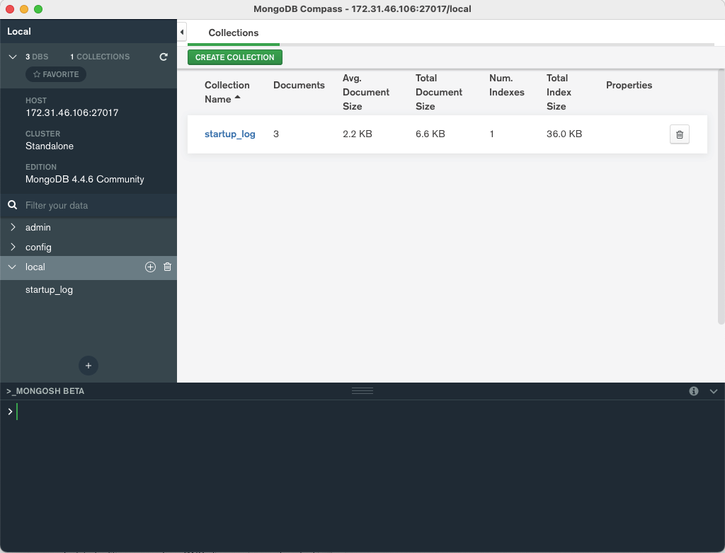 - standalone : mongodb://172.31.46.106:27017