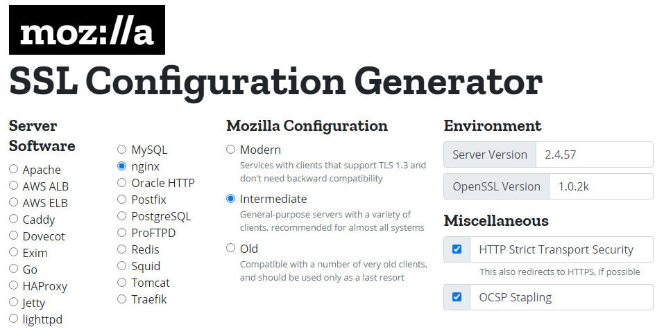 - Configuration Generator : https://ssl-config.mozilla.org/