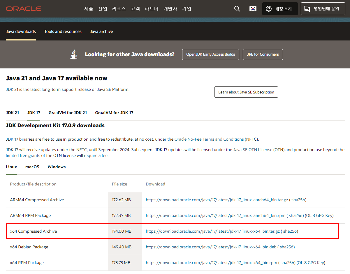 Oracle에서 JDK 17의 tar.gz 아카이브를 다운로드합니다.