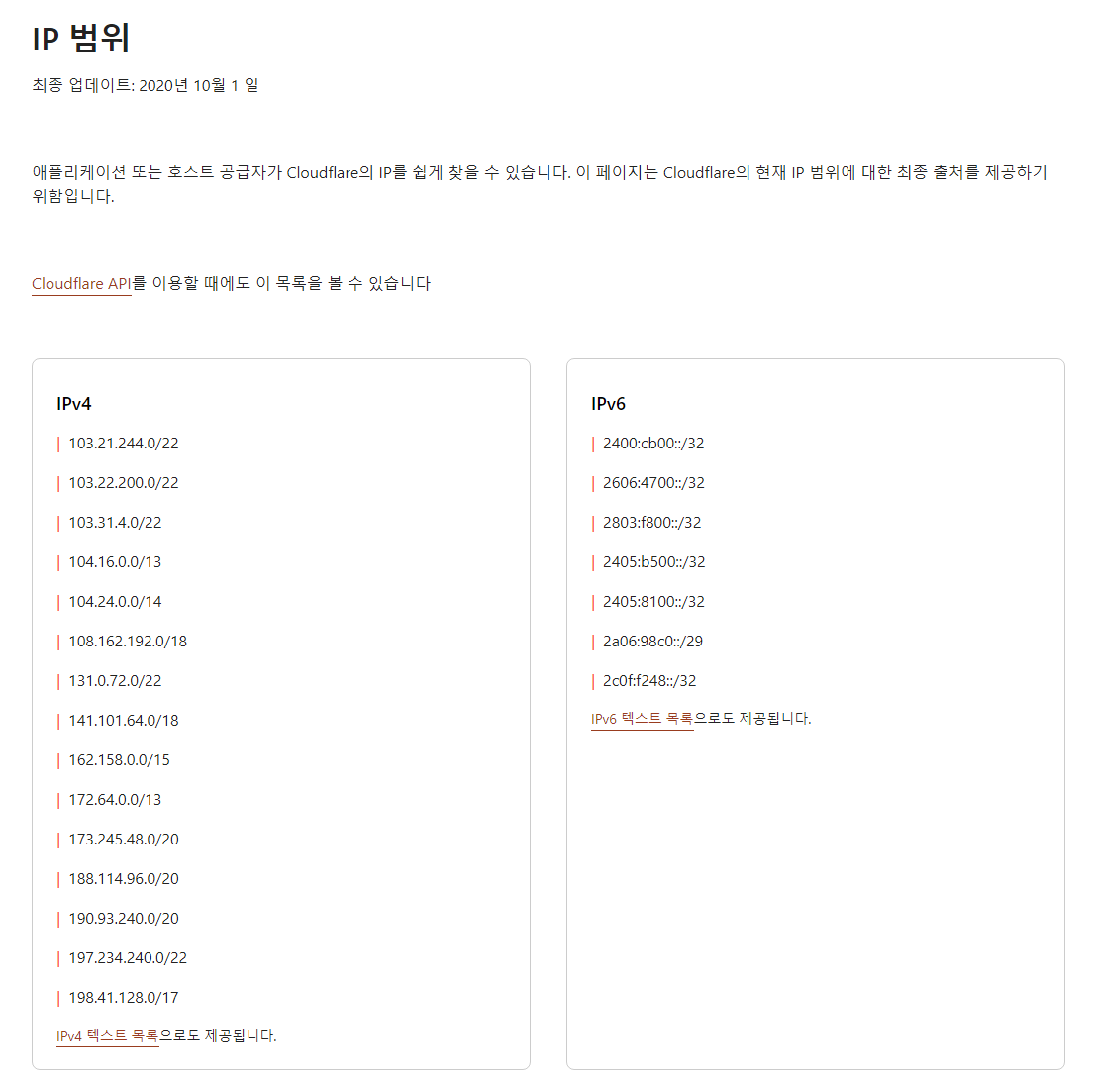 - IPv4 텍스트 목록 : https://www.cloudflare.com/ips-v4