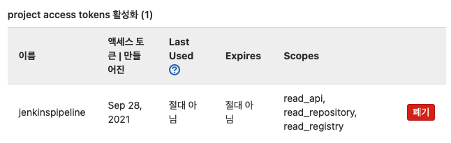 액세스 토큰 이름 : jenkinspipeline