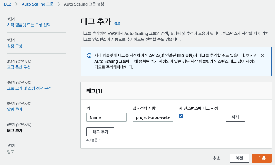 - 태그 키 : Name, 값 : project-prod-web-asg