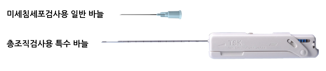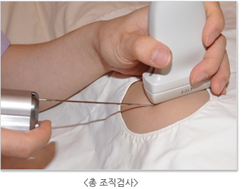 조직 채취는 국소마취를 진행한 후 초음파(모니터 화면)를 보면서 굵은 바늘이 달린 기구로 중심조직에 일부 채취합니다.