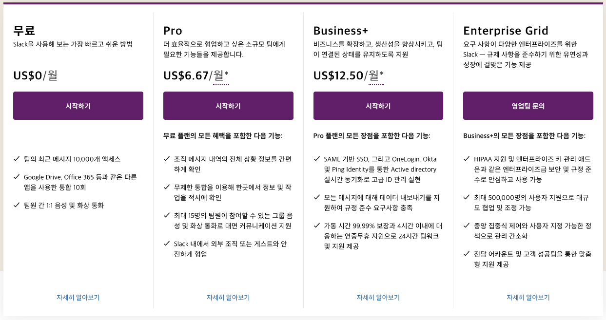 Slack 요금 : https://slack.com/intl/ko-kr/pricing